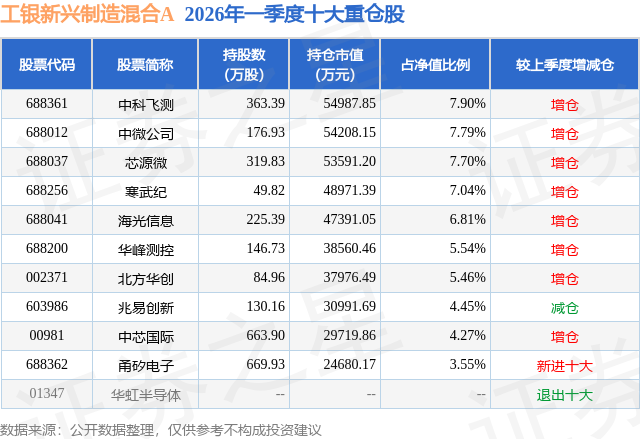 从基金规模来看,工银新兴制造混合A基金2026年一季度公布的基金规模为36.17亿元,较上一期规模7.07亿元变化了29.1亿元,环比变化了411.56%。该基金最新一期资产配置为:股票占净值比89.48%,无债券类资产,现金占净值比11.41%。从基金持仓来看,该基金当季前十大股票仓位达60.51%,第一大重仓股为中科飞测(688361),持仓占比为7.9%。
