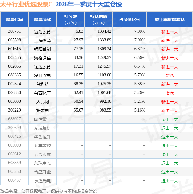 从基金规模来看,太平行业优选股票C基金2026年一季度公布的基金规模为0.47亿元,较上一期规模7819.18万元变化了-3085.63万元,环比变化了-39.46%。该基金最新一期资产配置为:股票占净值比90.37%,无债券类资产,现金占净值比8.34%。从基金持仓来看,该基金当季前十大股票仓位达60.77%,第一大重仓股为迈为股份(300751),持仓占比为7.0%。