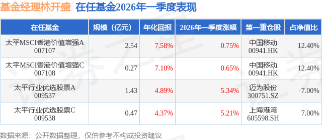 证券之星消息,日前太平行业优选股票C基金公布一季报,2026年一季度最新规模0.47亿元,季度净值涨幅为5.21%。