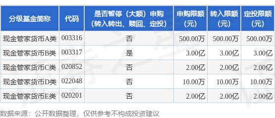 证券之星消息,4月25日中银国际证券股份有限公司发布《中银证券现金管家货币市场基金调整大额申购(含转换转入和定期定额投资)限额的公告》。公告中提示,为满足广大投资者的需求,更好地运作基金资产,自2026年4月27日起中银证券现金管家货币市场基金调整大额申购(含转换转入和定期定额投资)限额,下属分级基金调整明细如下: