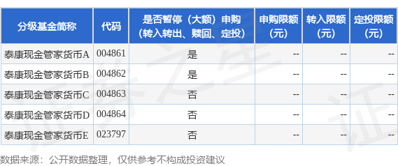 证券之星消息,4月25日泰康基金管理有限公司发布《泰康现金管家货币市场基金2026年“劳动节”假期暂停申购、转换转入业务公告》。公告中提示,为(1)根据《国务院办公厅关于2026年部分节假日安排的通知》(国办发明电〔2025〕7号)及沪深证券交易所休市安排,2026年5月1日(星期五)至5月5日(星期二)为节假日休市,2026年5月6日(星期三)起照常开市。(2)为保证本基金的稳定运作,保护基金持有人利益,根据《泰康现金管家货币市场基金基金合同》的相关规定,本基金管理人决定于2026年4月29日至2026年5月5日暂停本基金部分基金份额的申购及转换转入业务,自2026年4月29日起泰康现金管家货币市场基金2026年“劳动节”假期暂停申购、转换转入业务,下属分级基金调整明细如下:
