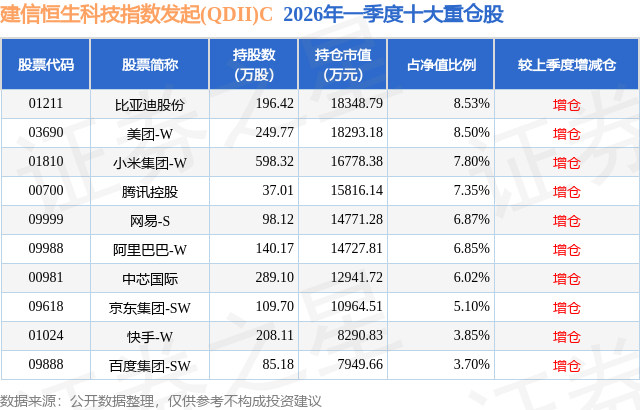从基金规模来看,建信恒生科技指数发起(QDII)C基金2026年一季度公布的基金规模为9.0亿元,较上一期规模3.28亿元变化了5.72亿元,环比变化了174.5%。该基金最新一期资产配置为:股票占净值比92.48%,无债券类资产,现金占净值比8.48%。从基金持仓来看,该基金当季前十大股票仓位达64.57%,第一大重仓股为比亚迪股份(01211),持仓占比为8.53%。