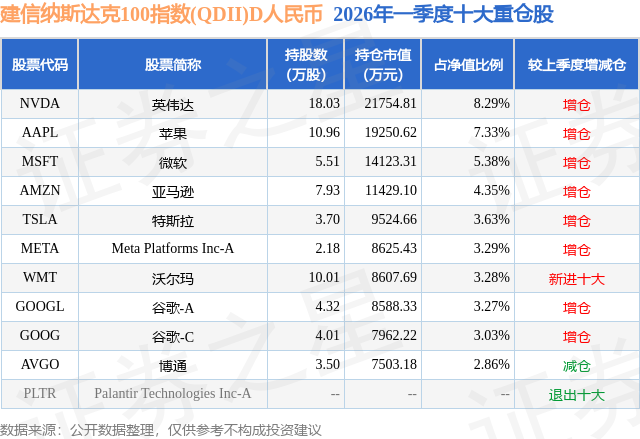 从基金规模来看,建信纳斯达克100指数(QDII)D人民币基金2026年一季度公布的基金规模为0.52亿元。该基金最新一期资产配置为:股票占净值比91.69%,无债券类资产,现金占净值比8.18%。从基金持仓来看,该基金当季前十大股票仓位达44.71%,第一大重仓股为英伟达(NVDA),持仓占比为8.29%。