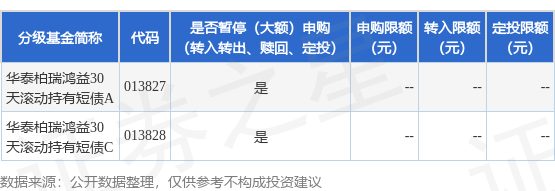 证券之星消息,4月27日华泰柏瑞基金管理有限公司发布《华泰柏瑞鸿益30天滚动持有短债债券型证券投资基金暂停代销机构申购和转换转入业务的公告》。公告中提示,为保证基金的平稳运作,维护基金持有人利益,自2026年4月29日起华泰柏瑞鸿益30天滚动持有短债债券型证券投资基金暂停代销机构申购和转换转入业务,下属分级基金调整明细如下: