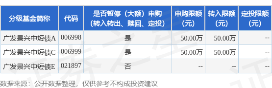 证券之星消息,4月27日广发基金管理有限公司发布《关于广发景兴中短债债券型证券投资基金A类和C类基金份额调整个人投资者大额申购(含转换转入、定期定额和不定额投资)业务限额的公告》。公告中提示,为保护基金份额持有人利益,自2026年4月29日起广发景兴中短债债券型证券投资基金A类和C类基金份额调整个人投资者大额申购(含转换转入、定期定额和不定额投资)业务限额,下属分级基金调整明细如下:
