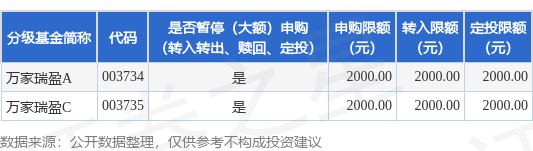 证券之星消息,4月27日万家基金管理有限公司发布《万家瑞盈灵活配置混合型证券投资基金基金暂停(大额)申购(转换转入、赎回、转换转出、定期定额投资)公告》。公告中提示,为了保证基金的平稳运作,保护基金份额持有人的利益,自2026年4月28日起万家瑞盈灵活配置混合型证券投资基金基金暂停(大额)申购(转换转入、赎回、转换转出、定期定额投资),申购、转换转入上限金额为0.2万元,下属分级基金调整明细如下: