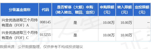 证券之星消息,4月27日兴证全球基金管理有限公司发布《关于兴全优选进取三个月持有期混合型基金中基金(FOF)暂停接受大额申购(含定投)、大额转换转入申请的公告》。公告中提示,为了保证基金的平稳运作,保护基金持有人利益,自2026年4月27日起兴全优选进取三个月持有期混合型基金中基金(FOF)暂停接受大额申购(含定投)、大额转换转入申请,申购、转换转入上限金额为10.0万元,下属分级基金调整明细如下: