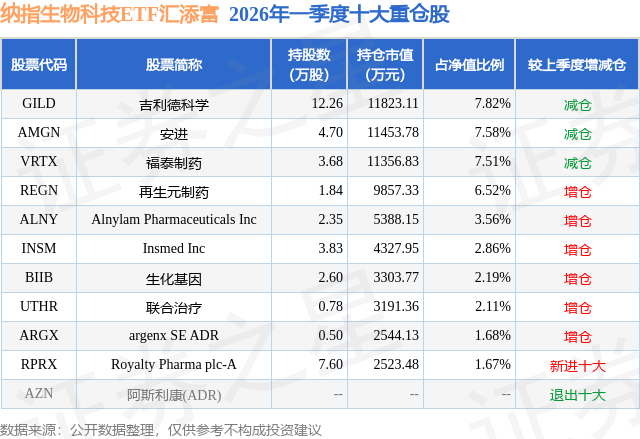 从基金规模来看,纳指生物科技ETF汇添富基金2026年一季度公布的基金规模为15.12亿元,较上一期规模15.11亿元变化了50.26万元,环比变化了0.03%。该基金最新一期资产配置为:股票占净值比92.15%,无债券类资产,现金占净值比0.85%。从基金持仓来看,该基金当季前十大股票仓位达43.5%,第一大重仓股为吉利德科学(GILD),持仓占比为7.82%。