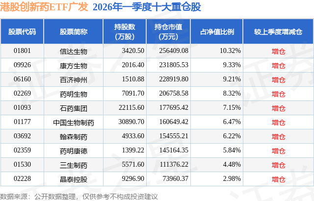 从基金规模来看,港股创新药ETF广发基金2026年一季度公布的基金规模为248.48亿元,较上一期规模234.03亿元变化了14.44亿元,环比变化了6.17%。该基金最新一期资产配置为:股票占净值比99.07%,无债券类资产,现金占净值比2.02%。从基金持仓来看,该基金当季前十大股票仓位达70.32%,第一大重仓股为信达生物(01801),持仓占比为10.32%。
