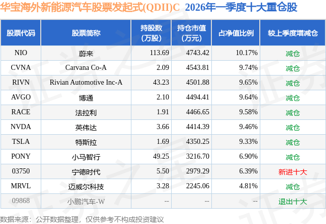 从基金规模来看,华宝海外新能源汽车股票发起式(QDII)C基金2026年一季度公布的基金规模为3.23亿元,较上一期规模2.1亿元变化了1.12亿元,环比变化了53.44%。该基金最新一期资产配置为:股票占净值比74.12%,无债券类资产,现金占净值比6.99%。从基金持仓来看,该基金当季前十大股票仓位达85.67%,第一大重仓股为蔚来(NIO),持仓占比为10.17%。