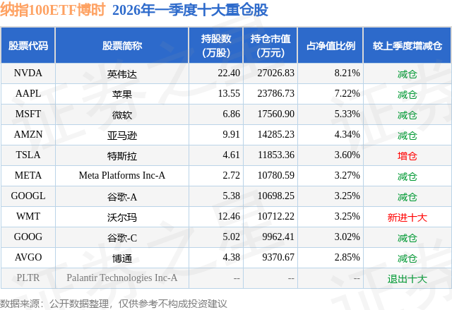 从基金规模来看,纳指100ETF博时基金2026年一季度公布的基金规模为32.94亿元,较上一期规模35.61亿元变化了-2.67亿元,环比变化了-7.5%。该基金最新一期资产配置为:股票占净值比93.45%,无债券类资产,现金占净值比4.99%。从基金持仓来看,该基金当季前十大股票仓位达44.34%,第一大重仓股为英伟达(NVDA),持仓占比为8.21%。