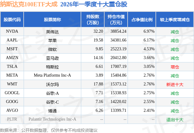 从基金规模来看,纳斯达克100ETF大成基金2026年一季度公布的基金规模为55.72亿元,较上一期规模59.73亿元变化了-4.01亿元,环比变化了-6.72%。该基金最新一期资产配置为:股票占净值比79.27%,无债券类资产,现金占净值比18.24%。从基金持仓来看,该基金当季前十大股票仓位达37.61%,第一大重仓股为英伟达(NVDA),持仓占比为6.97%。