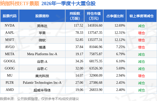 从基金规模来看,纳指科技ETF景顺基金2026年一季度公布的基金规模为111.72亿元,较上一期规模123.32亿元变化了-11.59亿元,环比变化了-9.4%。该基金最新一期资产配置为:股票占净值比93.69%,债券占净值比3.62%,现金占净值比1.24%。从基金持仓来看,该基金当季前十大股票仓位达70.74%,第一大重仓股为英伟达(NVDA),持仓占比为12.69%。