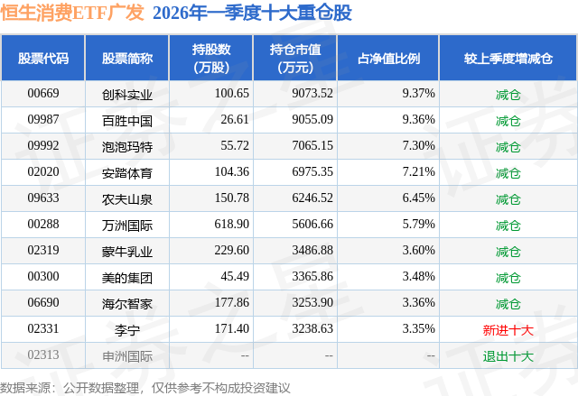 从基金规模来看,恒生消费ETF广发基金2026年一季度公布的基金规模为9.68亿元,较上一期规模11.73亿元变化了-2.06亿元,环比变化了-17.52%。该基金最新一期资产配置为:股票占净值比98.92%,无债券类资产,现金占净值比1.16%。从基金持仓来看,该基金当季前十大股票仓位达59.27%,第一大重仓股为创科实业(00669),持仓占比为9.37%。