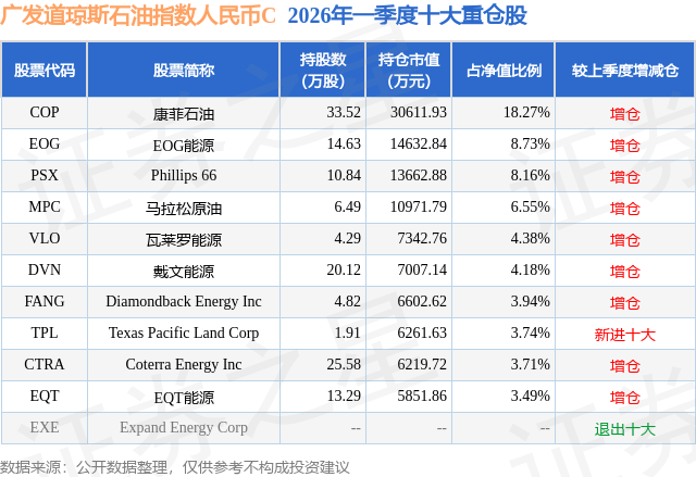 从基金规模来看,广发道琼斯石油指数人民币C基金2026年一季度公布的基金规模为3.42亿元,较上一期规模4.95亿元变化了-1.53亿元,环比变化了-30.85%。该基金最新一期资产配置为:股票占净值比91.58%,无债券类资产,现金占净值比8.53%。从基金持仓来看,该基金当季前十大股票仓位达65.15%,第一大重仓股为康菲石油(COP),持仓占比为18.27%。