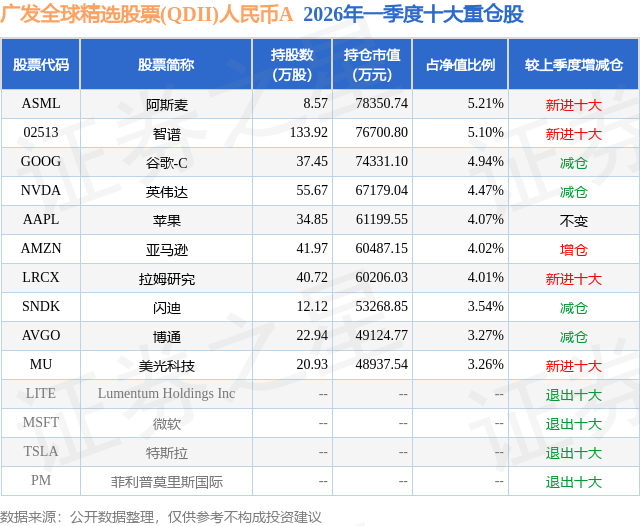 从基金规模来看,广发全球精选股票(QDII)人民币A基金2026年一季度公布的基金规模为112.68亿元,较上一期规模82.69亿元变化了29.99亿元,环比变化了36.26%。该基金最新一期资产配置为:股票占净值比87.14%,无债券类资产,现金占净值比9.84%。从基金持仓来看,该基金当季前十大股票仓位达41.89%,第一大重仓股为阿斯麦(ASML),持仓占比为5.21%。