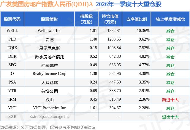 从基金规模来看,广发美国房地产指数人民币(QDII)A基金2026年一季度公布的基金规模为1.16亿元,较上一期规模1.36亿元变化了-2013.18万元,环比变化了-14.84%。该基金最新一期资产配置为:无股票类资产,无债券类资产,现金占净值比6.48%。从基金持仓来看,该基金当季前十大股票仓位达52.37%,第一大重仓股为Welltower Inc(WELL),持仓占比为10.36%。