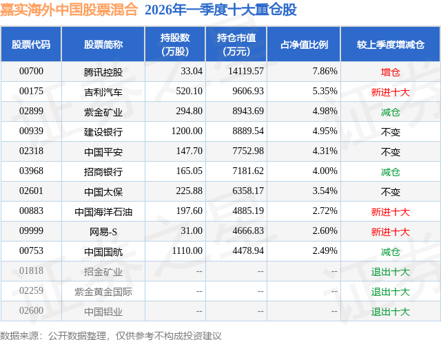 从基金规模来看,嘉实海外中国股票混合基金2026年一季度公布的基金规模为17.97亿元,较上一期规模16.72亿元变化了1.25亿元,环比变化了7.46%。该基金最新一期资产配置为:股票占净值比85.13%,无债券类资产,现金占净值比14.73%。从基金持仓来看,该基金当季前十大股票仓位达42.8%,第一大重仓股为腾讯控股(00700),持仓占比为7.86%。