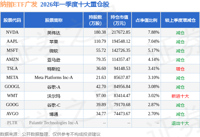 从基金规模来看,纳指ETF广发基金2026年一季度公布的基金规模为276.25亿元,较上一期规模297.75亿元变化了-21.5亿元,环比变化了-7.22%。该基金最新一期资产配置为:股票占净值比89.68%,无债券类资产,现金占净值比8.23%。从基金持仓来看,该基金当季前十大股票仓位达42.41%,第一大重仓股为英伟达(NVDA),持仓占比为7.88%。