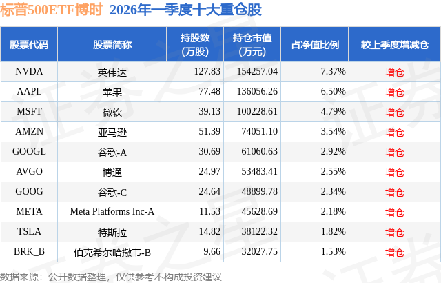 从基金规模来看,标普500ETF博时基金2026年一季度公布的基金规模为209.41亿元,较上一期规模223.2亿元变化了-13.78亿元,环比变化了-6.18%。该基金最新一期资产配置为:股票占净值比94.2%,无债券类资产,现金占净值比3.8%。从基金持仓来看,该基金当季前十大股票仓位达35.54%,第一大重仓股为英伟达(NVDA),持仓占比为7.37%。