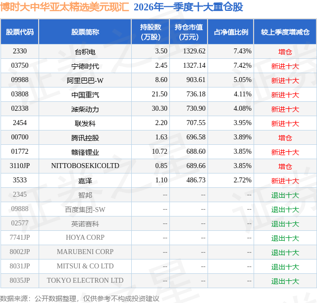 从基金规模来看,博时大中华亚太精选美元现汇基金2026年一季度公布的基金规模为1.79亿元,较上一期规模3238.22万元变化了1.47亿元,环比变化了452.99%。该基金最新一期资产配置为:股票占净值比81.21%,无债券类资产,现金占净值比30.11%。从基金持仓来看,该基金当季前十大股票仓位达46.35%,第一大重仓股为台积电(2330),持仓占比为7.43%。