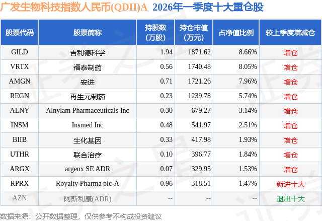 从基金规模来看,广发生物科技指数人民币(QDII)A基金2026年一季度公布的基金规模为1.66亿元,较上一期规模1.31亿元变化了3481.18万元,环比变化了26.48%。该基金最新一期资产配置为:股票占净值比84.93%,无债券类资产,现金占净值比6.22%。从基金持仓来看,该基金当季前十大股票仓位达42.83%,第一大重仓股为吉利德科学(GILD),持仓占比为8.66%。