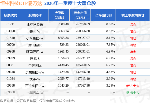 从基金规模来看,恒生科技ETF易方达基金2026年一季度公布的基金规模为295.53亿元,较上一期规模270.25亿元变化了25.28亿元,环比变化了9.35%。该基金最新一期资产配置为:股票占净值比94.33%,债券占净值比1.71%,现金占净值比4.24%。从基金持仓来看,该基金当季前十大股票仓位达65.74%,第一大重仓股为比亚迪股份(01211),持仓占比为8.88%。