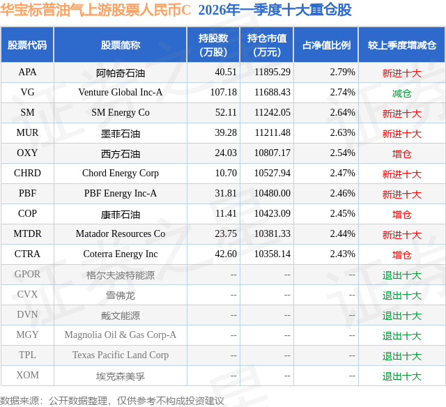 从基金规模来看,华宝标普油气上游股票人民币C基金2026年一季度公布的基金规模为6.12亿元,较上一期规模17.9亿元变化了-11.78亿元,环比变化了-65.81%。该基金最新一期资产配置为:股票占净值比92.68%,无债券类资产,现金占净值比8.28%。从基金持仓来看,该基金当季前十大股票仓位达25.59%,第一大重仓股为阿帕奇石油(APA),持仓占比为2.79%。