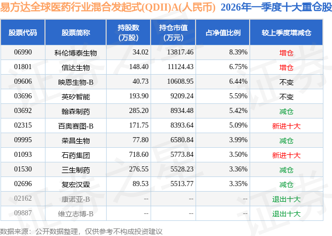 从基金规模来看,易方达全球医药行业混合发起式(QDII)A(人民币)基金2026年一季度公布的基金规模为10.78亿元,较上一期规模8.29亿元变化了2.49亿元,环比变化了29.99%。该基金最新一期资产配置为:股票占净值比91.91%,无债券类资产,现金占净值比7.26%。从基金持仓来看,该基金当季前十大股票仓位达51.88%,第一大重仓股为科伦博泰生物(06990),持仓占比为8.39%。