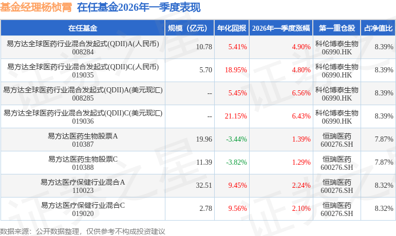 证券之星消息,日前易方达全球医药行业混合发起式(QDII)A(人民币)基金公布一季报,2026年一季度最新规模10.78亿元,季度净值涨幅为4.9%。