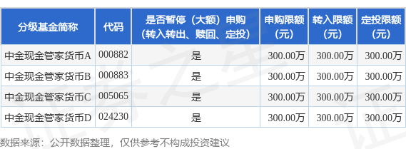 证券之星消息,4月28日中金基金管理有限公司发布《关于中金现金管家货币市场基金暂停大额申购(包括转换转入、定期定额投资)业务的公告》。公告中提示,为保护中金现金管家货币市场基金份额持有人的利益,自2026年4月29日起中金现金管家货币市场基金暂停大额申购(包括转换转入、定期定额投资)业务,申购、转换转入上限金额为300.0万元,下属分级基金调整明细如下: