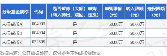 证券之星消息,4月28日中国人保资产管理有限公司发布《人保货币市场基金2026年五一假期前调整大额申购、转换转入及定期定额投资业务限额的公告》。公告中提示,为根据中国证监会相关规定及沪深交易所休市安排,为保护持有人利益,特暂停相关业务,自2026年4月29日起人保货币市场基金2026年五一假期前调整大额申购、转换转入及定期定额投资业务限额,申购、转换转入上限金额为50.0万元,下属分级基金调整明细如下: