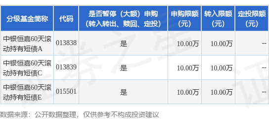 证券之星消息,4月29日中银基金管理有限公司发布《关于中银恒嘉60天滚动持有短债债券型证券投资基金暂停大额申购、转换转入及定期定额投资业务的公告》。公告中提示,为保护基金份额持有人利益,自2026年4月29日起中银恒嘉60天滚动持有短债债券型证券投资基金暂停大额申购、转换转入及定期定额投资业务,下属分级基金调整明细如下:
