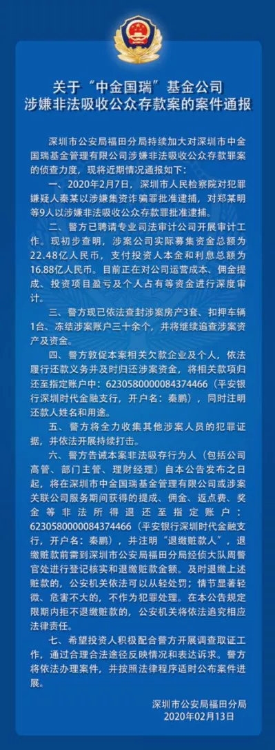 今年2月份的警方通报中,警方告诫该案非法吸存行为人(包括公司高管、部门主管、理财经理),自2月13日起将在中金国瑞或涉案关联公司服务期间所获提成、佣金、返点费、奖金等非法所得退还至指定账户。