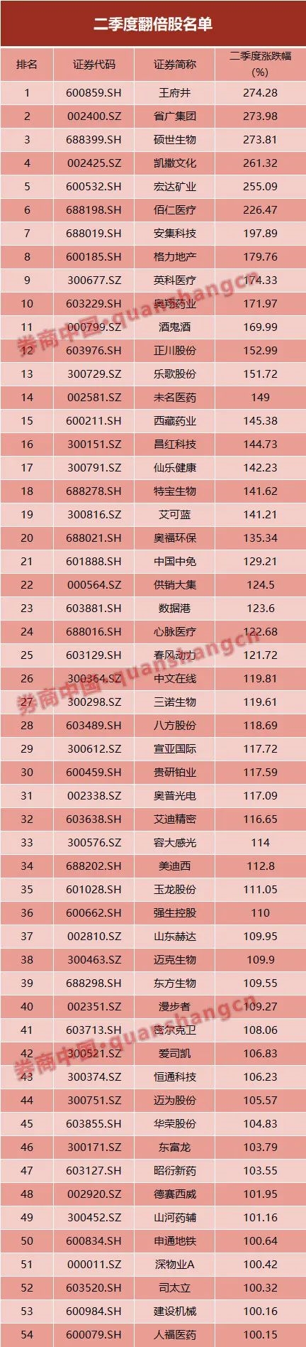 A股二季度54只个股翻倍