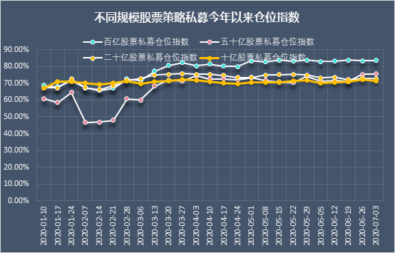 目前公私募股票基金仓位仍处于历史高位。好买基金研究中心显示,7月6至7月10日数据显示,该周偏股型基金整体小幅减仓0.09%,当前仓位69.89%。其中,股票型基金仓位下降0.72%,标准混合型基金仓位下降0.00%,当前仓位分别为87.73%和67.52%。