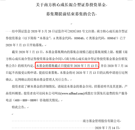 同时,南方基金就紧急发布南方核心成长混合型基金提前结束募集的公告,截至7月13日,该基金募集期内的募集总规模已超过募集规模上限,该基金的募集截止日提前至7月13日,并自7月14日起不再接受认购申请,提前结束募集。同时将对7月13日的认购申请进行比例确认,比例确认的结果由基金管理人另行公告。