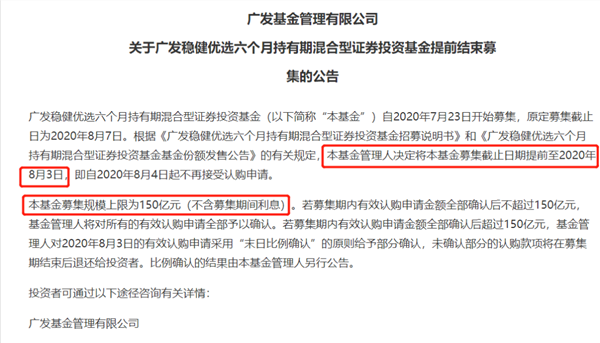 广发基金也出现了爆款产品。广发基金8月3日公告称,广发稳健优选六个月持有期混合型基金自7月23日开始募集,原定募集截止日为8月7日,该公司决定将基金募集截止日期提前至8月3日,即自2020年8月4日起不再接受认购申请。
