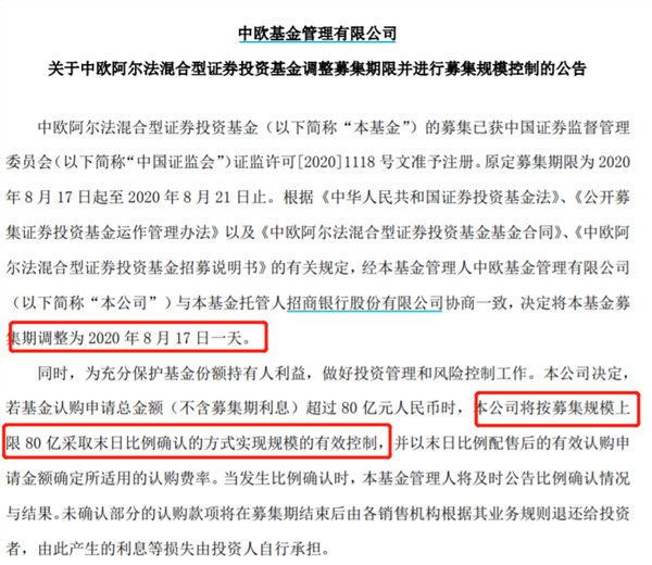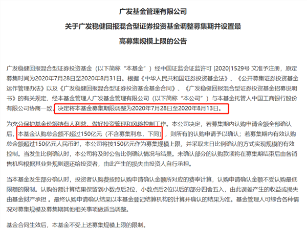 如广发基金8月6日就宣布,广发稳健回报混合基金原定募集时间为2020年7月28日至2020年8月31日,而目前将募集期限调整为2020年7月28日至2020年8月13日。同时,将基金募集规模上限设置为150亿元。