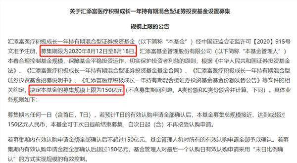 不仅如此,汇添富医疗积极成长一年期也宣布募集期限为8月12日至8月18日。本着合理控制基金规模,保障基金平稳投资运作,切实保护投资者利益的原则,决定该基金的募集规模上限为150亿元。