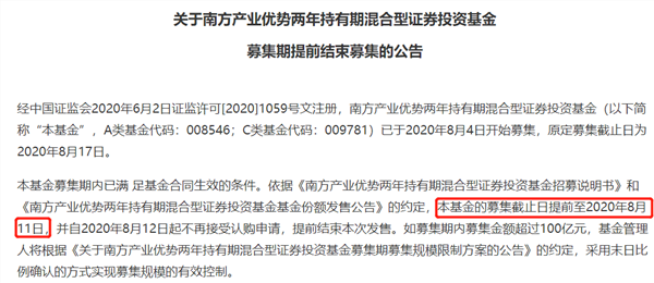 而8月6日也有基金公司宣布提前结束募集。如8月4日开始募集的南方产业优势两年持有期混合型基金就宣布提前结束募集,该基金原定募集截止日为8月17日,现在提前至8月11日,并自8月12日起不再接受认购申请。如募集期内募集金额超过100亿元,将采用末日比例确认的方式实现募集规模的有效控制。