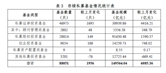 截至7月末,私募证券基金的规模单月大增4416.21亿元,规模突破3万亿大关,达到3.09万亿,环比增长16.65%,私募证券投资基金产品数量共46973只;私募股权投资基金28814只,存续规模9.16万亿元,环比增长1.77%;存续创业投资基金9054只,存续规模1.43万亿元,环比增长5.54%。