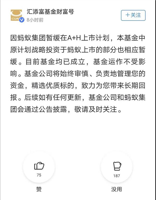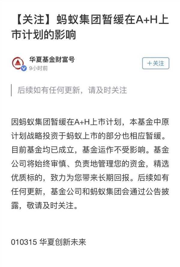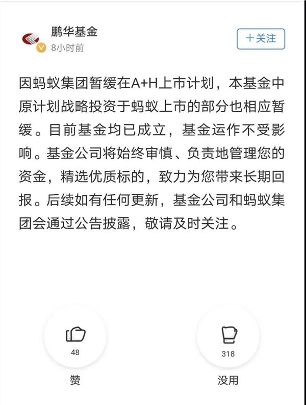 基金君发现,对于蚂蚁集团的战略配售在A股、H股同时暂缓上市,就有创新未来基金在支付宝的财富号中公告显示:因蚂蚁集团暂缓在A+H上市计划,创新未来基金中原计划战略投资蚂蚁上市的部分也相应暂缓。目前基金均已成立,基金运作不受影响。基金公司将始终审慎、负责地管理您的基金,精选优质标的,致力为您带来长期回报。