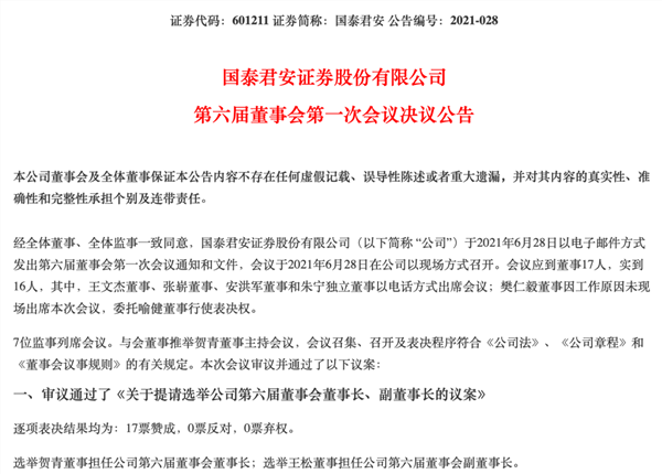 6月28日晚间,国泰君安连发多项公告,宣布完成董事会、监事会及经营层换届。