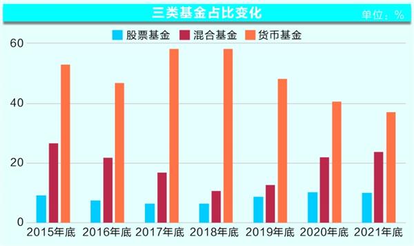 股票型基金和混合型基金占比持续提升,体现出投资者对股市的看好。整体上看,权益类基金也给投资者带来较好的回报。证券时报·数据宝统计,2021年权益基金回报率中位数在6%以上,2020年回报率中位数在40%以上。
