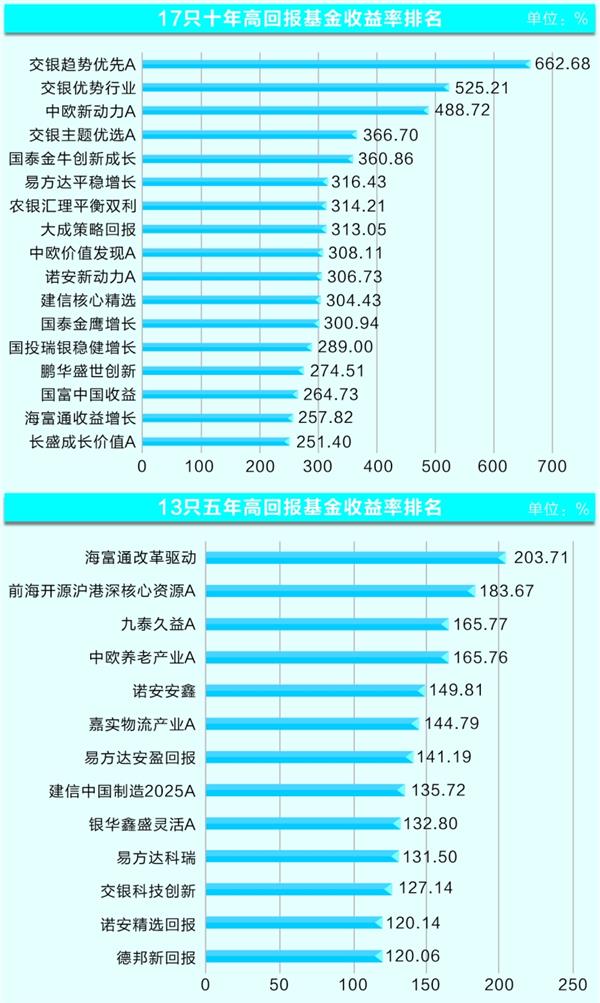 数据宝统计,此前三轮回调期净值最高回撤都低于上证指数同期跌幅,且本轮最高回撤低于20%的基金(净值及回撤数据均截至上周五),有17只基金十年净值增长率在250%以上,交银趋势优先A、交银优势行业、中欧新动力A等基金回报率超480%。