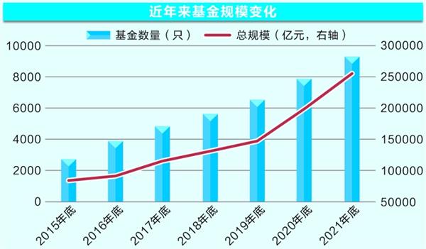 中国基金业协会数据显示,截至去年底,最新公募基金产品数量为9288只,公募基金总规模为25.56万亿元,较2020年底增长5.67万亿元,增幅高达28.51%。近年来,公募基金规模呈现高速增长态势,2016年底超过9万亿元,2017年超过11万亿元。从增速来看,6年多来基金规模平均增速超过20%,其中2020年增速超过34%,为近年来最高。