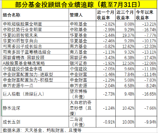 受A股震荡调整状态,7月公募基金全市场业绩指数收跌1.87%,其中偏股混合型、主动股票型基金业绩指数调整较大,7月跌幅分别为4.13%和3.74%。与此同时,偏股类基金投顾组合在7月的回撤主要在1%-3%区间,低于公募基金的平均跌幅。
