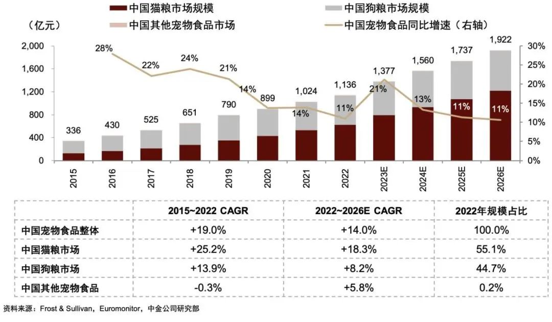 中国宠物食品行业在过去十几年间快速成长,据Frost & Sullivan数据,2022年中国宠物食品市场规模为1,136亿元,近年来保持较快增长,2015-2022年CAGR为+19.0%,且Frost&Sullivan预计2026年市场规模有望增至1,922亿元,对应2022-2026年CAGR为+14.0%。