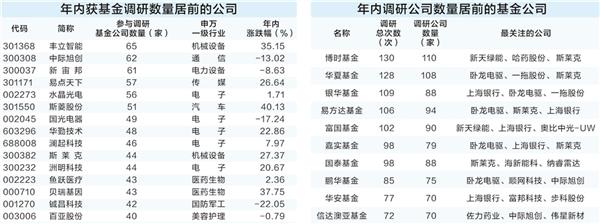 10家基金公司年内调研超过70家上市公司。博时基金年内调研上市公司数量最多,达110家,新天绿能、哈药股份、斯莱克是其最关注的三家公司。博时基金调研的公司中,电子、计算机行业的公司均占15家,调研后行情表现较好的有祥鑫科技、云天励飞-U、斯莱克,股价上涨幅度均超40%。
